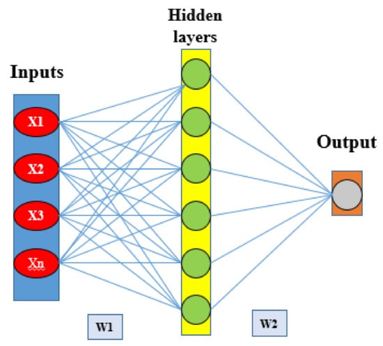 ANN is a popular machine learning algorithm that simulates the neural networks of a human brain and can work in a specific way [52,53]. It is used to analyze and predict non-linear statistical datasets by using different algorithms [54]. ANN has been widely used in pattern recognition and classification studies [55]. Therefore, classifications of the landscape in different ordinal areas of the GES zone are treated as a classification problem. Different types of algorithms have been used in ANN modeling; among them, multi-layer perceptron (MLP) is the most popular, based on its outcome results and frequency of use by researchers [56]. To run and analyze ANN algorithms, some basic knowledge is needed to understand the structure of input data and the relationship between the variables [57]. The ANN model with the MLP algorithm consists of three layers, namely, the input layer, hidden layer, and output layer. A schematic diagram of the feed-forward artificial neural network model is shown in Figure 5. In this research work, the input layers are training points for the erosion of the gully and the various GECFs, which have finally been connected to the output layer. Input nodes help to predict and analyze the model structure through input and hidden layers and, ultimately, to evaluate the output layer result [58,59]. This output layer gives us the GES map. The output layer consists of Boolean values of 0 and 1, in which 0 represents non-gully erosion and 1 represents gully erosion. Feed-forward of the ANN algorithm model deals with three stages, namely, feed-forward of input data, calculation, and backpropagation of related errors and their adjustments [57].