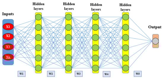 DLNN is a well-accepted machine learning model among research groups throughout the world. This ML model has a prominent advantage in appropriately constructing a high-level feature by using the raw dataset [27]. DLNN consists of three layers, i.e., an input layer, several hidden layers, and resulting in an output layer [60]. The speculative configuration of the DLNN model used for GES mapping in this research work is shown in Figure 6. The general structure of the DLNN model is to run in such a way that the input layer receives signals that are different GECFs, this information is processed and analyzed in several hidden layers, and finally, the output model’s result is presented in the last layer, i.e., the output layer. The output layer has two possible labels, i.e., the first one is a negative label (non-gully erosion) and the second one is a positive label (gully erosion). These classification results are obtained from the last hidden layer and shown in the output layer [61].