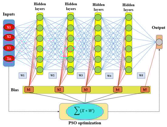 In very recent times, the deep neural learning network (DLNN) is a striking ML algorithm and has been widely used by several research groups. This method was proposed for the first time in 2006 and includes different key features of ML as well as artificial intelligence (AI). The DLNN algorithm consists of fully convolutional neural networks (CNNs), deep belief networks (DBNs), stacked auto-encoder (SAE) networks, etc. [26]. In addition to this, the Adaptive moment estimation (Adam) and Rectified Linear Unit (ReLU) algorithms were used for training and activation purposes in every learning unit of a DLNN model [27]. Generally, the DLNN algorithm has been used in different fields such as feature extraction and transformation through supervised and unsupervised processes, recognition of patterns, and classification [28]. On the other hand, the particle swarm optimization (PSO) algorithm is an extended part of AI and an amalgamation of the conventional ML techniques. The PSO algorithm is based on swarm intelligence, and it is straightforward with efficient universal optimization techniques [26]. PSO is used for the feature selection of a dataset through optimization techniques.