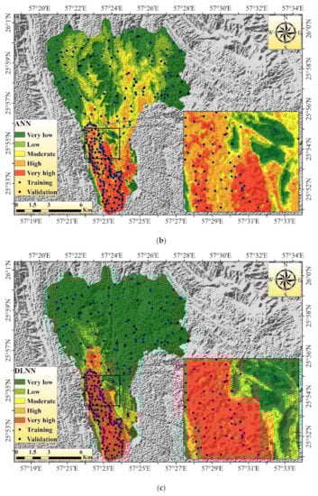 Head-cut gully erosion map using the four models: (a) SVM; (b) ANN; (c) DLNN; (d) PSO-DLNN.