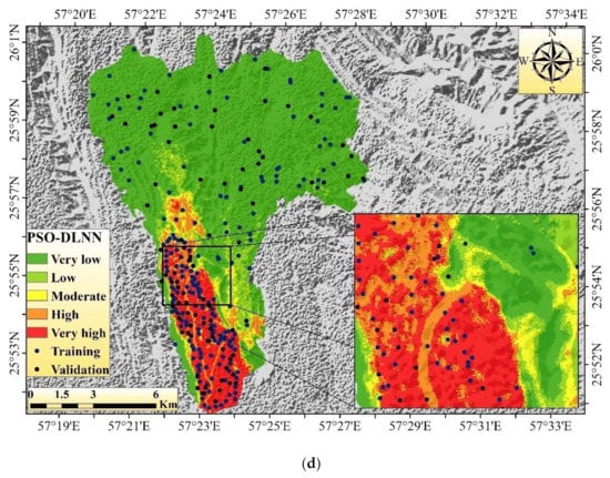 In the PSO-DLNN model, the areal coverages of low, low, moderate, high, and very high gully erosion susceptibility zones are 94.58 (74.80%), 8.15 (6.45%), 4.03 (3.19%), 6.31 (4.99%), and 13.38 (10.58%) km2, respectively. According to the GES map of the PSO-DLNN model, the major portion of the area is occupied by very low (74.80%) to low (6.45%) susceptibility classes, while very high (10.58%), high (4.99%), and moderate (3.19%) susceptibility classes cover the rest of the studied region respectively. Very high, high, and moderate gully erosion susceptibility zones mainly occupy the southern portion of the watershed, and the rest of the portions are associated with very low to low susceptibility zones (Figure 8d).