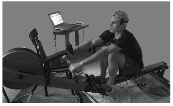 Event-related potential (ERP) measures, which are the focus of this paper, have the well-known limited spatial resolution but a high temporal resolution, which is essential to analyse complex movements: for example, the time course of feedback and feedforward processing in visuomotor learning [12,13]. Conventional EEG systems are very sensitive to mechanical (cable and electrode movements) and physiological (electromyogram (EMG) of head and neck muscles, and sweating) movement artefacts [14]. If cognitive processes in a moving subject rather than the movement itself are the focus of interest, data preprocessing algorithms informed by the behavioural movement data can be used to clean the EEG data from movement-related (neuronal and artefactual) activity [15,16]. If the motor-related activity is of interest, advanced data preprocessing algorithms such as independent component analysis (ICA) [17] can be used to correct such artefacts. However, a study measuring ERPs during walking and running on a treadmill showed that data loss was very high (on average 130 of 248 EEG channel signals remained), even using a system with active electrodes that are considerably less prone to artefacts than conventional passive electrodes [18,19]. Furthermore, the usability of conventional EEG systems such as the one used in these studies is limited for measures with moving subjects. In movement tasks with only marginal head movements, such as cycling on an ergometer, these laboratory systems combined with ICA-based artefact correction can be applied successfully for EEG measures [20]. Ref. [21] found in a high-intensive cycling exercise an increase in spectral power when the athletes were fatigued. If spectral changes of higher EEG frequencies (alpha to gamma) are the focus of interest, such as in ref. [21], artefacts directly coupled to movement execution are outside of this frequency range, because movement frequencies are considerably lower. However, the harmonics of these movement frequencies may occur, which have to be considered. With fully moving subjects, in contrast, artefacts are more difficult to handle. In a cocktail party study (including eating, drinking, chatting, etc.) with ten subjects wearing self-made (noncommercial) wireless EEG headsets, about 40% of the data were lost due to artefacts in contrast to 4% in two laboratory studies [22]. Despite this high data loss, these studies revealed valuable ERP [18,19] or spectral EEG [22] results. However, especially in movement research, the method of choice is to avoid the generation of mechanical artefacts beforehand by technical modifications. This approach was used in the four pilot studies reported in this paper that tested the suitability of different technical solutions to measure ERPs during ergometer rowing (Figure 1). Especially for analysing motor-related brain activity with ERPs, rowing is well suited. It is a cyclic movement with a high number of repetitions, and the degrees of freedom of the movement are limited by the biomechanical constraints of the equipment (boat and scull/oar, or ergometer). Furthermore, in contrast to e.g., cycling or kayaking, the rowing movement is composed of different (more or less) distinct movement elements, and the movement frequency is lower (20–40 strokes/min vs. 60–120 revolutions/min in cycling). Finally, the biomechanical data (dynamics and kinematics of the movement, and boat and scull/oar movement), which are partly necessary for ERP analysis, can be measured meanwhile with relative ease.