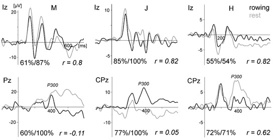 Event-related potential (ERPs) of the visual oddball task comparing rowing and rest for all three subjects (M, J, and H) of pilot Study 1. Upper graphs: visual evoked potentials (VEPs) evoked by the frequent checkerboard stimulus at electrode site Iz (referenced to Cz to obtain a larger and cleaner signal because VEP activity and electromyogram (EMG) artefacts are lower at Cz compared to the mastoids). Below: the P300 waveform at Pz/CPz (linked mastoid reference for M and H, and right mastoid for J due to the lost left mastoid channel). The vertical line marks the stimulus onset. The numbers at the bottom of each graph present the percentage of artefact-free trials included in the averages for rowing and rest of the chosen electrode site and the correlation coefficients (Pearson) of the two waveforms. The high dropout rate for subject H was mainly due to eye-blink artefacts. For subject M, three channels (FCz, CPz, and CP4) were lost completely due to artefacts during rowing: for subject J, the left mastoid channel was lost. Furthermore, a P300 is missing during rest for J, because he did not count the target because of an imprecisely given instruction. For M and H, the P300 was larger during rest. The ERPs of the deviant stimulus condition are not displayed, because they showed results similar to those of the frequent condition.