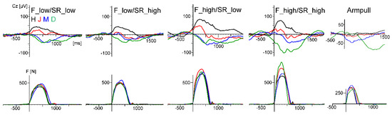 The upper row displays the force-onset triggered individual averages (subjects D, M, J, and H) of the ERP at Cz (referenced to AFz) and at the bottom, the averaged force graphs for the five rowing conditions (F: force, SR: stroke rate). ERPs at C3 and C4 were very similar to Cz and therefore omitted in this figure. The ERPs showed within-subject similarities with a higher activity in conditions three and four with the higher force output; however, there were large between-subject differences. The waveforms of subject D were largely affected by sweating artefacts in conditions four and six. Characteristics of rowing performance. Condition one: F_low, SR_low (individual mean values, range 19.4–21 min-1, 98–102 W). Condition two: F_low, SR_high (25.5–27.6), 121–163 W. Condition three: F_high, SR_low (19.8–21.3), 159–192 W. Condition four: F_high, SR_high (26.1–28.6), 225–270 W. Condition six: arm pull only (stroke rate 26.2–29.1), 50–57.5 W.
