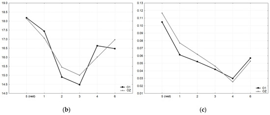 Figure 10a displays the VEPs generated by the standard stimulation (checkerboard) of the oddball task for all four subjects and conditions. For direct comparison, the VEPs measured at active electrode O1 and passive electrode Oz are superimposed. As in the previous studies, the VEPs were similar between rowing and rest, and the intraindividual differences were much smaller than the interindividual differences. Remarkably, the VEPs measured at O1 and Oz were highly congruent. Figure 10b displays the peak differences (maxima–minima in the interval 50 to 300 ms) of the VEP waveforms (mean of all subjects) for the six conditions. The SNR revealed the highest values in condition five (rest) and the lowest in condition four (Figure 10c).