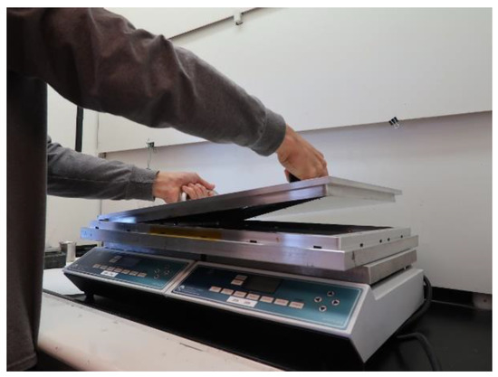 Next, the lid is removed, and the ferrous polymer is left attached to its bottom surface. To create the clean polymer, a 0.25-mm thick layer of SEEPS polymer (no iron), the mold is pre-heated to 200 °C. Ten spacers of height 0.25 mm are placed around the inside rim of the mold. A mass of 15 g of pellets (4044) is mixed with 75 g of mineral oil in an insulated cup and heated on a hot plate to 265 °C. The polymer is degassed in a 250 °C pre-heated oven for 4 min at a vacuum pressure of 91.4 kPa. The polymer is quickly poured onto the base of the mold and spread. The lid with the ferrous layer still adhered to it is placed into the base. The lid is quickly clamped at the edge on the four sides using the same eight clamp positions described above. The mold is removed from the hot plates (Figure 3) and cooled. This assembly is termed the ferrous polymer/polymer construct (FPPC).