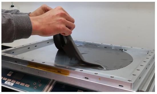 To begin, the base of the mold, which is of inner dimension 38 cm × 53 cm and made of aluminum (6061-T6), is prepared by coating it with a thin layer of mold release agent, covering it with an aluminum lid, and heating it on hot plates set to 285 °C.