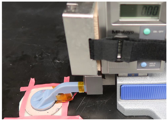Calibration tests were performed using a test setup similar to that described previously [20] (Figure 5). A sensor antenna was mounted to a plastic arm extending laterally from a vertical height gauge (570-312, Mitutoyo, Aurora, IL, USA) (resolution 0.01 mm) such that the sensor was positioned above the e-FPPC. Sensor data and height gauge readings were recorded at increments of 0.25 mm for a sensor distance above the target from 0.00 to 2.00 mm, and at increments of 1.00 mm for distances of 2.00–15.00 mm. Data were also collected with no target present. The value with no target was subtracted from all data within a trial. Samples were tested from five locations on a 38 cm × 53 cm e-FPPC sheet that reflected anterior and posterior regions of interest. To calculate measurement inconsistency across the sheet, we fit calibration data from all five locations with one equation. The equation was the sixth-order polynomial with the smallest least squares error to all of the collected data and was termed the mean calibration. The absolute value of the distance offset of the data at each of the five locations relative to the mean calibration (root mean square error) was calculated. This distance offset corresponded to the deviation in measurement of thickness relative to the mean.