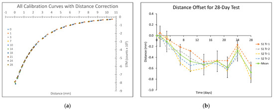Calibration results (counts/mm) changed over time. From before wear to the last day of wear (Day 28), counts/mm increased between 9.0% and 42.4% depending on the target-to-socket distance. This change was a result of the calibration curve shifting over time to the left. For the 0.00–5.00 mm distance range, the range of primary clinical interest in this application, the change in counts/mm caused an absolute value percent error between the post-Day 0 data and the Day 0 calibration curve of between 0.8% and 33.3% (median 16.4%). The shifting of the calibration curve to the left may have been due to compaction of the outer elastic fabric and polymer layers of the e-FPPC over time. When the data were corrected for this distance offset after Day 0 (i.e., shifting the y-intercept of the post-Day 0 calibration curves), it well-aligned for all days (Figure 6a). When the distance offset correction was made, the absolute value percent error between the post-Day 0 data and the Day 0 calibration curve for the 0.00–5.00 mm distance range was between 0.4% and 4.4% (median 2.0%). We further found that the distance offset change decreased approximately linearly over time for about 12 days, and subsequently was more stable (except for one outliner point at Day 24) (Figure 6b).