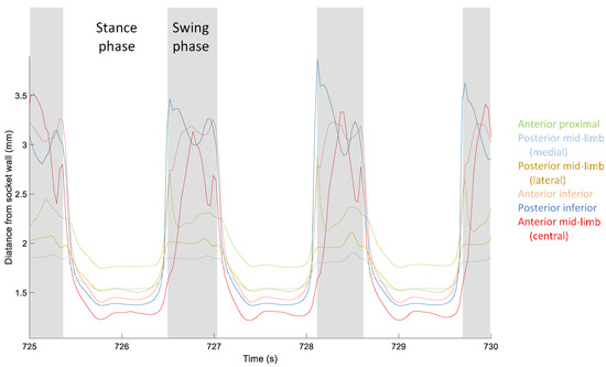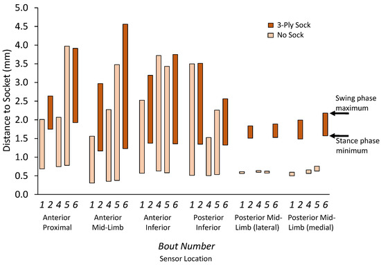 Clinical testing was conducted on an amputee participant with trans-tibial amputation. Internal Review Board approval was obtained, and a written informed consent form was signed before any test procedures were initiated. The participant walked on a treadmill at a comfortable walking speed wearing an instrumented socket and a ferrous liner. Sensor antennae were embedded within the socket at six locations: anterior proximal near the socket brim; mid-limb at anterior, posterior lateral, and posterior medial locations; and inferior at anterior and posterior locations. The participant conducted six bouts of walking on a treadmill at a self-selected walking speed wearing the ferrous liner and instrumented socket. Each walking bout was approximately 5 min in duration and was preceded by a stand under equal weight-bearing of approximately 5 min. Different liner and sock configurations were worn in different bouts. During Bouts 1, 4, and 5, the participant wore the ferrous liner with no socks. During Bouts 2 and 6, the participant wore the ferrous liner with a three-ply sock. The sock was positioned between the ferrous liner and the socket. During Bout 3, the participant wore a different liner with no socks. The total duration of the testing protocol was approximately 75 min. Sensor signals were converted to distance using calibration data and plotted as a function of time. Shapiro–Wilks tests conducted to evaluate normality showed that data from one of the 5-min walking bouts was not normally distributed, thus Wilcoxon signed rank tests were used for all statistical comparison.
