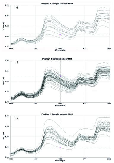 Near Infrared Spectroscopy (NIR) spectra obtained from a remote reflectance fiber-optic probe applied directly to samples of ham. (a) 100% Iberian animals fed in “montanera2 (IM), (b) Iberian animals fed in “montanera” (CM) and (c) fodder-fed Iberian animals (CC).