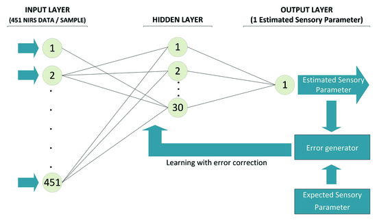 The multilayer perceptron (MLP) feedforward artificial neural network (ANN) was used for processing the absorbance values obtained. The 451 values of NIR absorbance feed the input layer which had 451 neurons. The hidden layer has a variable number of neurons between 1 and 30 depending on the sensory parameter predicted and used the hyperbolic tangent sigmoid function. The output layer used the pure linear transfer function and has only one neuron. This neuron shows the estimated value of one of the sensory parameters. The use of a known seed value number to randomly initialize the weight and bias matrix allows us the reproducibility of data [24]. The pairs of NIRS-sensory data, i.e., input-output data, were randomly divided for all ANNs into three sets as follows: training, validation, and test set that accounts for the 70%, 15%, and 15% of the data respectively. Then, 28 ANN architectures, one for each of the sensory parameters, were optimized. Tests were carried out with the Scaled Conjugate Gradient Backpropagation and Levenberg–Marquardt Backpropagation training algorithms. The Deep Learning Toolbox of MatLab (MathWorks®) in its R2018 version was the software used for all the tests.