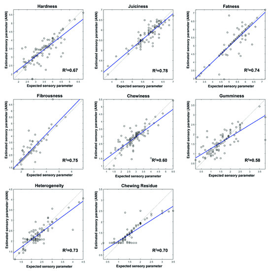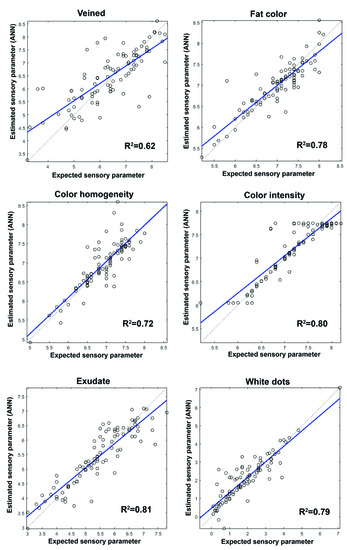 The prediction network generated was further tested with 14 samples of ham (a set test) which were neither part of the training nor the validation set. The mean squared errors (MSEs) between the targets and the ANN outputs were assessed (Table 5). The MSEs found varied between 0.0196 and 0.5878; the highest errors occurred in the prediction of the texture and visual parameters. The best results in the prediction of sensory parameters were obtained for the parameters related to flavor. The lower prediction capacity of the network could be seen in the attributes of pig aroma, atypical aroma, sourness, and gumminess with an R2 between 0.51 and 0.59 (Figure 4 and Figure 5). However, when the network generated was checked against the set test the number of errors made by the network in the prediction of these parameters is low. The values obtained in all the sensory parameters analyzed suggest that the network generated can be applied satisfactorily to unknown samples.