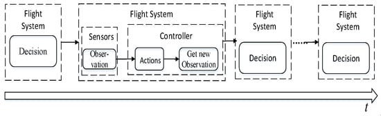 Naturally, observations of a system have a certain frequency, which means that multiple states with a timeline could be obtained, as shown in Figure 2. At each time a state is observed, a proper decision should be made (which usually means some control parameters, such as speed), and then a new state could be observed and a new decision should be made. Such a process would continue until the UAV lands successfully or reaches a certain step state. Therefore, the control of UAV autonomous tracking and landing can be regarded as a sequential decision problem.