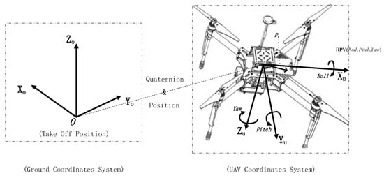 - State S: Represents the state of the system, including the state of the UAV and moving platform; the system coordinates are constructed as in Figure 3. On the basis of this coordinate system, the state information could be described by the respective speeds and positions of the UAV and platform, as in Equation (1):where .