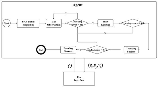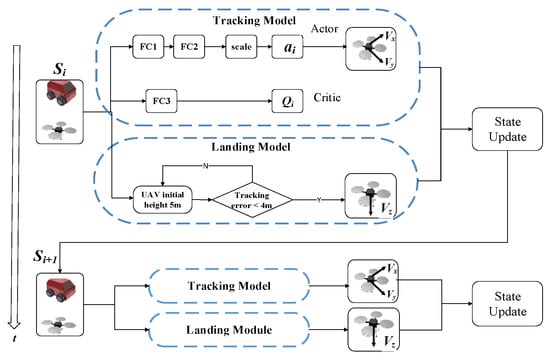 The hybrid strategy adopted in this paper is shown in Figure 4. The strategy consists of two parts: tracking and landing modules. The tracking module introduces the reinforcement learning method to adjust the speed of the UAV in the horizontal direction, aiming to achieve the stable tracking of the moving platform. The landing module adjusts the height of the UAV in the vertical direction based on heuristic rules, so as to land the UAV on the platform.