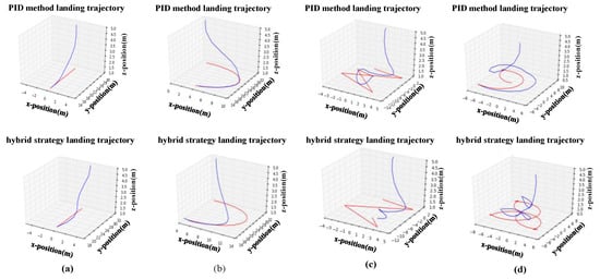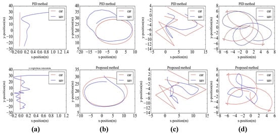 Table 3 shows the RMSE and TSR values of the tracking modules compared with the PID controllers (a complete description of PID controllers and parameters are shown in Appendix A). The moving platform has four different types of motion trajectories, including linear, circular, and random motion. The results show that, although the tracking performance of the PID method is more stable, when encountering complex motion, the RMSE of the proposed method is smaller. Compared with the VIEW percent indicator, the PID method is more likely to cause the loss of the tracking target. Figure 7 shows the trajectory of the UAV in the x-y plane while following a moving platform. Figure 7c,d show that the PID method could fit the motion trajectory of the platform, but it has a large response hysteresis and response error; therefore, compared with the PID method, the proposed method is more effective in solving the problem of tracking large-scale changes in moving platforms.