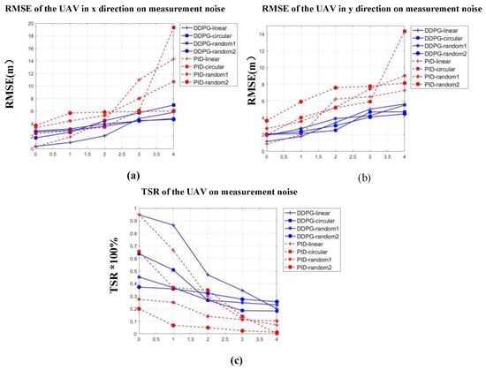 Tracking results on measurements error: (a) root-mean-square error (RMSE) of UAV in the x-direction, (b) RMSE of UAV in the y-direction, and (c) tracking success rate (TSR) of UAV.