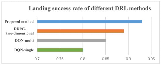 Additionally, in order to further validate the performance of our proposed model, we compare the landing success rate of the proposed method with other deep reinforcement learning methods. The results of the test phase are summarized in Figure 10. The bar chart compares the performances of the DQN-single [30], DQN-multi [30], DDPG (two-dimensional) [5,32], and the proposed method. In all tests, the moving platform performed a uniform straight-line motion at a speed of 3 m/s. In this case, the proposed method has the highest success rate with an accuracy of 93%, the DDPG (two-dimensional) has the similar performance (89%). The DQN-single follows with a score of (85%). The DQN-multi score is significantly lower (80%). The results show that the method proposed in this paper can more effectively solve the problem of a UAV’s autonomous landing in high-dimensional and continuous action space.