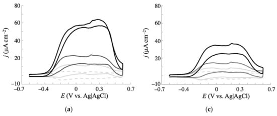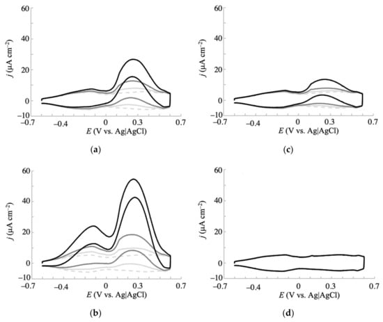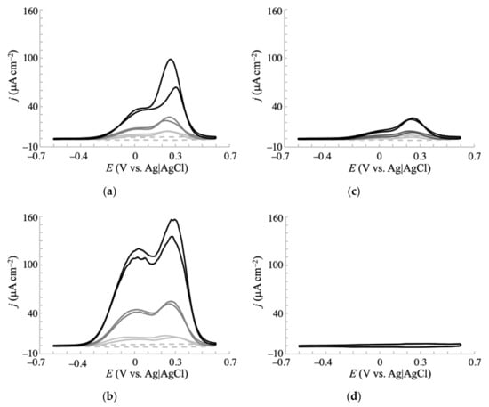 Cyclic voltammograms of (a) glucose, (b) galactose, (c) mannose, and (d) fructose in 0.1 M phosphate buffer (pH 7.5) obtained at an NPG-500 electrode with a scan rate of 20 mV s−1. Concentrations of each saccharide: 0 mM (dashed gray line), 1 mM (solid light gray line), 3 mM (solid gray line), and 10 mM (solid black line).