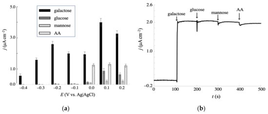 To prepare a calibration plot for galactose detection, we performed amperometric measurements at −0.1 V, of which potential showed relatively lower standard deviations, less interference effect, and higher current density, with successive additions of galactose at different concentrations. The amperogram and calibration curve are presented in Figure 7a,b, respectively. The calibration plot was linear from 10 μM to 1.8 mM, with a sensitivity of 1.0 μA cm−2 mM−1 and a correlation coefficient of 0.998. The limit of detection (LOD) was estimated to be 5.0 mM. To assess the analytical performance of the present sensing system, the characteristic parameters such as LOD, linear range, sensitivity, response time, working potential, and enzyme requirement were compared with earlier electrochemical galactose sensors (Table 1). Although the sensitivity is lower compared to some enzymatic sensors, the other parameters are comparable and less positive working potential enabling less interference effects was achieved. Thus, the potency of the present non-enzymatic type galactose sensor was indicated because it has an advantage of no requirements of the enzyme reagents such as galactose oxidase and dehydrogenase.