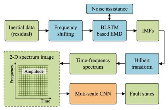 The proposed FD method is shown in Figure 1. First, the inertial data is processed by a frequency shifting operation. Second, a BLSTM-based EMD algorithm is performed to obtain the IMFs, and the noise assistance algorithm is used to process the signals of computing different IMFs. Third, we use Hilbert transformation to construct the Hilbert spectrum, which is used to feed the 2-D features to the CNN. Finally, the MS-CNN outputs the fault classifications.