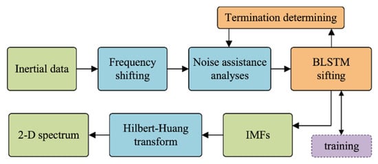 In this section, we formulate the proposed HHT method. The proposed HHT structure is shown in Figure 2. First, the frequency shifting [] is applied to reduce the mode mixing. Second, the BLSTM-based EMD is performed to compute the IMFs of inertial data and noise assistance analysis. Ensemble empirical mode decomposition (EEMD) [] is used to further reduce the mode mixing. Finally, the Hilbert-transform (HT) is performed so that the IMFs cam obtain the time–frequency spectrum.