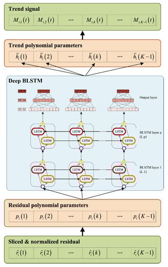 where  indicate the coefficients of fitting in each segment. The local extrema points are generated from , and this makes each segment in  monotonic, so that it can be easily fitted by a cubic polynomial. Furthermore, the trend signal is the residual by removing the high-frequency  from , which means that piecewised fitting can aptly describe a “low frequency” trend signal. Note that Equation (14) presents a strategy to code data in each segment to a fixed-dimension expression, which is essential for BLSTM.