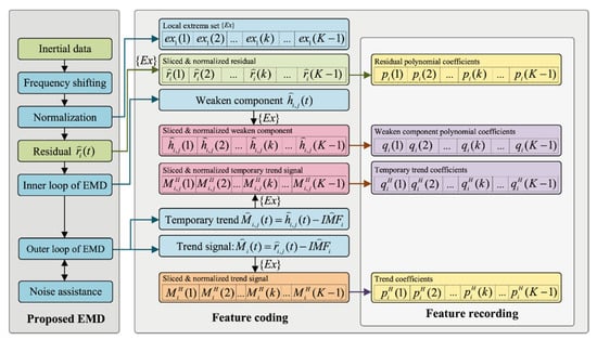 Figure 4 indicates the modified EMD with data recording operation. Note that the symbol “^” indicates the normalized signal. The proposed three-part method includes the proposed EMD, feature coding, and feature recording. The proposed EMD consists of frequency shifting, classic EMD, and noise assistance analysis. The first step is the frequency shifting operation [] The second step is normalization, as seen in Equation (16), to obtain the normalized residual ; then the processed data is fed to the classic EMD framework. Note that the classic EMD in Figure 4 is represented as an inner loop and outer loop. The inner loop is used to compute each IMF and the outer loop is used to compute the IMFs. The outer loop of the proposed EMD adopts the EEMD [] to reduce the mode mixing. The feature coding operation converts the data of the improved EMD to the four-dimension fitting parameters. The first operation of the feature coding is piece wising the residual . Each  in an EMD operation is piecewised by the extrema points of the original signal , as follows: