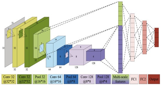 Figure 14 shows the mean classification accuracy for different FC configurations. Note that “FC-i” indicates the one-layer FC configuration and “FC-i-j” indicates the two-layer FC configuration, and that “i” indexes the neurons in the first FC layer and “j” indexes the neurons in the second FC layer. For the one-layer CNN, the FC-512 has the highest mean accuracy of 94.9992%, with a standard deviation of 0.3142. Then we added one FC layer to the network “FC-512.” We found that the network “FC-512-128” obtained the best mean classification accuracy of 97.1571%, with a standard deviation of 0.3218. Therefore, the multiscale CNN, FC-512-128, was adopted for FD operation.