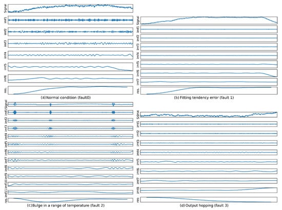 HHT is a time–frequency analysis method that consists of empirical mode decomposition (EMD) and Hilbert transform (HT), and it offers high performance in analyzing nonstationary signals by adopting EMD to compute intrinsic mode functions (IMFs). Many researchers have adopted HHT-based methods to perform data analysis tasks [,,]. The FD methods combining HHT and CNN are becoming research hotspots in different applications, such as power distribution system FD [], geared system FD [] and pipeline system FD []. Our research aims to recognize fault patterns hidden in large volume of real MEMS inertial sensors measurement data that are non-stationary due to the affection of variable temperature condition, study on HHT-based feature extraction algorithm offers a reliable fault feature representation strategy on handling nonstationary MEMS temperature related faults.