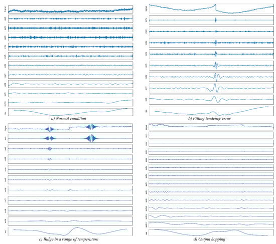 where  indicates the time stamp of each local extrema of . EMD is a method that removes frequency components from residual, which means that the local extrema points  that partition a high-frequency signal into  monotonical intervals can partition low-frequency weakened components without any information missing. After the  is obtained, the weakened component , temporary trend , and trend  are piecewised according to . The final step of feature coding is cubic polynomial fitting each segment of these piecewised signals, and this is what generates the polynomial coefficients. The data recording operation creates the dataset for training the BLSTM model.
