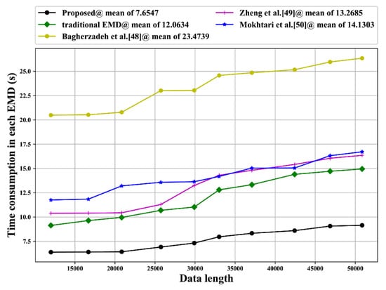 We compared the EMD efficiency between our proposed EMD method and other EMD methods in terms of the time required for performing an EMD operation. To perform this comparison, we chose various inertial measurement unit (IMU) data with different lengths, which were 11,996, 16,679, 20,836, 25,726, 29,899, 33,002, 37,086, 42,429, 46,861, and 50,854. Results are shown in Figure 13, Our proposed method had the lowest time consumption, with a mean of 7.6475 s for each EMD. The EMD method in 45 had the longest time, 23.4739 s, for performing each EMD, whereas the traditional EMD took 12.0634 s to perform each EMD. The EMD methods in 46 and 47 took approximately the same amount of time as the traditional EMD, 13.2865 s and 14.1303 s respectively, to perform each EMD.