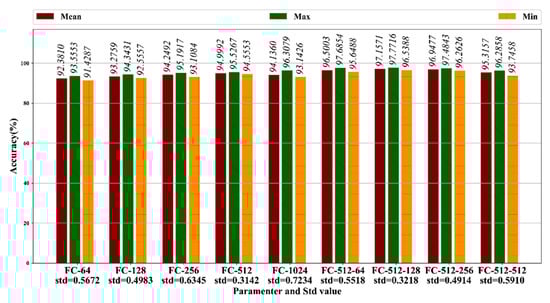 We tested the classification accuracy of the proposed multiscale CNN in the case of different fully connecting (FC) layer configuration. The results are shown in Figure 14. We first tested the one-layer FC performance in a different number of neurons to find the best one-layer FC configuration, then added an FC layer based on the optimal one-layer FC structure and found the two-layer configuration structure with the best classifying performance. The classification accuracy was evaluated according to a 10-times mean accuracy test. The metrics we chose were minimum, maximum, mean, and standard deviation. The adam optimizer and cross-entropy were used to train the CNN. The training epochs were set to 200, and the batch size was 16.