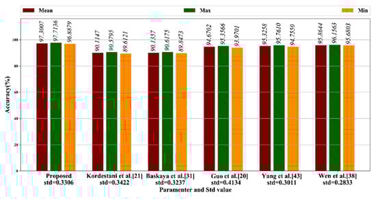 We compared the mean fault classification accuracy by performing our inertial dataset on each method. The results, as shown in Figure 15, indicate the mean, minimum and maximum classification accuracy after being run 10 times. The results show that our method achieved the best fault classification accuracy, at 97.3007%. The CNN-based methods, which are proposed by Guo et al. [], Yang et al. [] and Wen et al. [] achieved mean FD accuracies of 94.6702%, 95.3258%, and 95.8644%, respectively. The machine learning-based methods, which are Kordestani et al.’s ANN-based method [] and Baskaya et al.’s SVM-based method [] achieved FD accuracies of 90.1147% and 91.1357%, respectively.