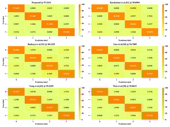 We further compared the misclassification performance by using confusion matrix analysis. Figure 16 shows the FD accuracy confusion matrix of each FD method. Our proposed method obtained the best accuracy, at 97.2434%. The fault 1 and fault 3 achieved lower accuracies, respectively, whereas fault 0 had the worst accuracy, and fault 2 achieved the best accuracy. Kordestani et al. [] had the worst total accuracy of 90.0904% with the largest misclassification. Similar to the mean accuracy results, the CNN-based methods, which are proposed in 20, 43, and 38, have smaller misclassifying results than the machine learning-based FD methods proposed in [,].