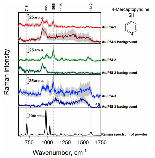 Raman spectrum of 4-Mpy powder and mean SERS spectra of 5 × 10−6 M concentration of 4-MPy on the surfaces with different morphology: Au/PSi-1, Au/PSi-2 and Au/PSi-3. Error scale bar (shown as grey shadow) for all presented spectra indicates the standard deviations from around 1500 measured spectra from three different areas of the substrate.