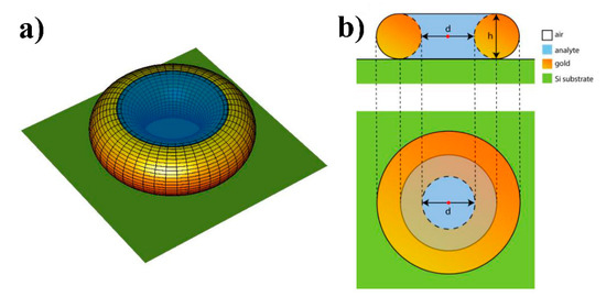 where is the electric field of the incident plane electromagnetic wave taken at the center of the torus (red point in Figure 5b), A is the area occupied by the torus on the two-dimensional (2D) plane and V is the analyte volume. The Raman signal intensity calculated by Equation (1) is averaged over the orthogonal polarization states of incoming wave. From the electrodynamic point-of-view, this method of calculating the Raman signal intensity is analogous to the method of calculating the photoluminescence intensity where the excitation and out-coupling efficiencies are calculated separately at different photon energies and wavevectors [54]. In the case of Raman signal intensity, we neglect by difference between the energies of excitation and scattered light due to the small Stokes shift. Moreover, in our model we consider the excitation and collection angles to be zero that enables us to use Equation (1); however, inclined angle corrections can be done. We note that such a naive model does not account for many facts such as a discrete character of the scattering volume, real size of molecules, geometry imperfections etc. From the other side, the internal diameter of pores can be interpreted as the interparticle distance, and, as will be evident below, this model enables us to explain the experimental fact that there is an optimal Au internal diameter which provides the maximal Raman signal enhancement.