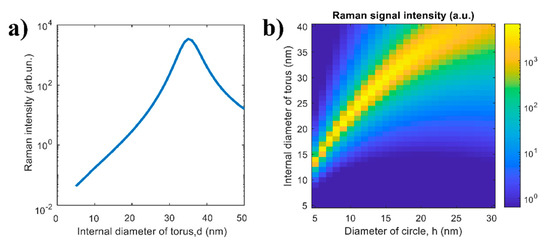 The Raman intensity as a function of the internal diameter of torus d calculated by Equation (1) at h = 20 nm is shown in Figure 6a. One can see that there is an optimal value of the parameter d ≈ 35 nm, where the Raman signal is maximal. This is explained by the fact that with an increase of d the relative volume of analyte substance increases while the average electric field at the position of analyte molecules decreases. This situation is also observed for larger diameters of circle, h (Figure 6b); however, the optimal value of the parameter d increases. The considered example argues that the presence of the optimal internal diameter for the Raman signal intensity can be explained and understood from the optical viewpoint.