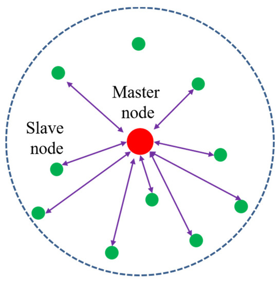 - Round. This is used to represent the repetition of the initialization process. As illustrated in Figure 2, a master node executes the one-to-one initialization with multiple slave nodes in one round. The index of a round is defined as . does not increase to infinity but can increase to the maximum value (), where is a network parameter and can be determined according to network conditions. Here, the round is simply denoted by .