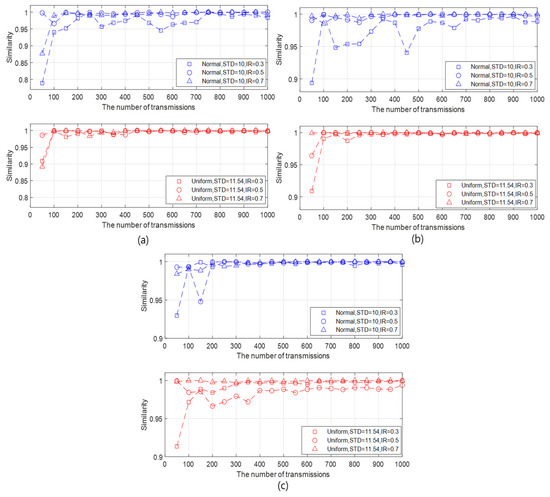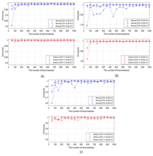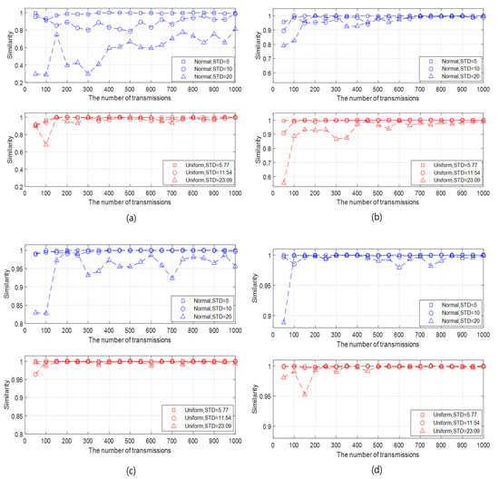 - It can be intuitively predicted that the higher similarity is guaranteed as the initialization rate becomes higher and the STD of the generated data set is lower. This prediction is confirmed in various cases by changing the STD of the generated data and the initialization rate, as illustrated in Figure 4a–d.