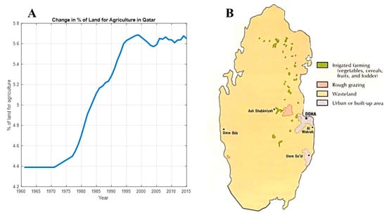 (A) Change in % of land for agriculture in Qatar; (B) distribution of agricultural land in Qatar.