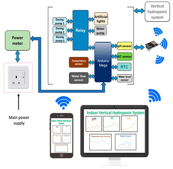 The block diagram of the automated vertical hydroponic system consists of six parts: main power supply, power meter, sensing and control system, vertical hydroponic structure, Wi-Fi module, and online database. The overall block diagram is shown in Figure 2. All the sensors connected to the vertical hydroponic system can be monitored from the IoT platform on any smart device. There is a power meter module for continuous monitoring the power consumption of the system in order to make the system power efficient and possible for large scale expansion. Each part of the block diagram will be discussed in detail in the later sections of the paper.