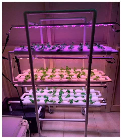 Various vertical hydroponic systems such as A-frame, Zig-zag, vertical hydroponic tower, ZipGrow tower and vertical Nutrient Film Technique (NFT) system were available. Amongst the various vertical hydroponic systems available, the concept and design of the vertical NFT system was considered to be used for this study [,,,]. It is due to the simplicity in the design, ease in its assembly, easy configurability of the LED, high productivity of plants within a small place, and the strong supporting system that holds the structure. Many organization, such as Plenty, Bowery, Aerofarms, and Ikea etc., are commercially producing different vegetables in urban areas using proprietary architecture and technologies with the help of the professionals using large scale indoor farming with high scale investments [,,]. Even though these are helping fulfilling food demand and promoting urban farming, however, these are not suitable for individual level and cannot be done by the people without technological knowledge.