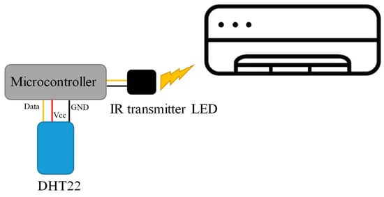 It is essential to maintain the temperature in a specific range for the healthy growth of plants in an indoor hydroponic system. Plants require a certain range of temperature, which allows the suitable environments for the plants to grow healthier, and better. The optimal range for temperature is between 19–28 °C [,]. In order to control the temperature and the humidity of the room, an air conditioning subsystem (Figure 4) with automatic triggers to turn the AC on or off was implemented []. The system used the data coming from the temperature sensor, and through the infrared (IR) transmitter LED, it can send a signal to the AC to control [,].