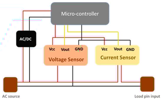 The power meter has two ports: input and output, where the input of the power meter is connected to 240 V alternative current (AC) source and the output port is connected to the hydroponic system (load). The power meter consists of micro-controller, AC/DC converter (HLK-PM12 (ShenZhen, China)) to power-up the micro-controller (Arduino Nano (Somerville, MA, USA)), a current sensor (ACS712 (Worcester, MA, USA)) and a voltage sensor (ZMPT101B (Guangzhou, China)) to measure the current and the voltage consumption of the loads, details are provided in the Supplementary Table S1. All the measured data were sent to the central micro-controller to measure the total power consumption (Figure 5).