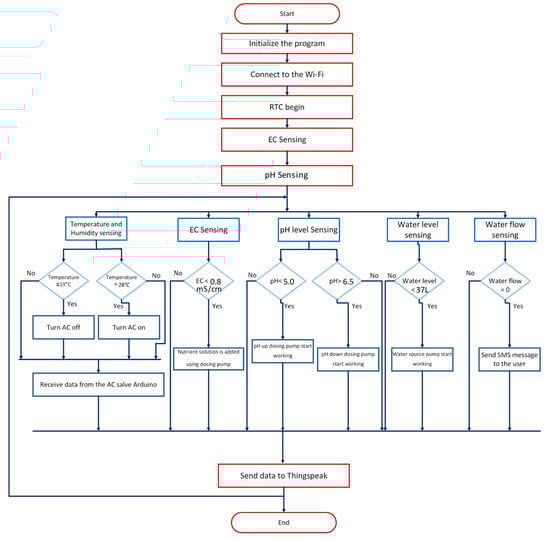 Various sensors used in the design had to be calibrated before using them. The overall circuit diagram of the system is shown in Figure 7, which represent all the sensors and the AC appliances connected with each other along the connection of the AC controller and power meter subsystem. Two different types of Arduinos were used, which are Arduino Mega (Somerville, MA, USA) and Arduino Nano (Somerville, MA, USA), details in supplementary Table S1. The AC controller is designed around Arduino Mega and the power meter using an Arduino Nano and both of them send data to the master Arduino Mega through serial communication. Figure 8 illustrates the working principle of the complete automatic hydroponic system based on the sensor reading.