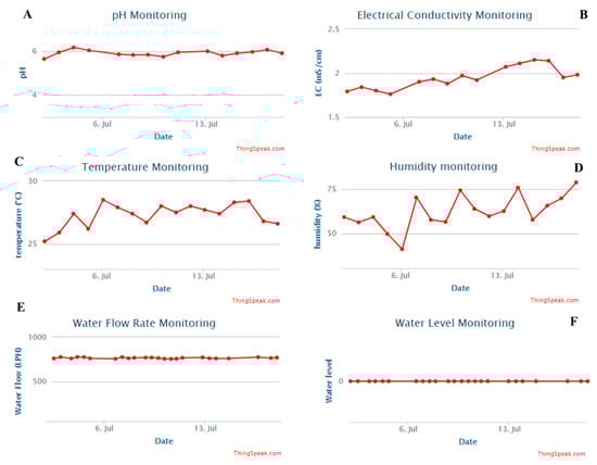 Sample graphs of the Thingspeak Web-interface of IoT platform: (A) pH, (B) EC, (C) Temperature, (D) Humidity, (E) Water flow rate, and (F) Water level monitoring.