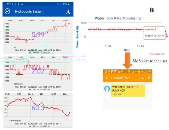 In this paper all the reading of the sensors such as: pH, EC, water level, humidity, and temperatures sensors along with the power consumptions of the system were sent to web server, through a Wi-Fi-module, ESP8266 (Shanghai, China) []. The Wi-Fi-module is connected to the microcontroller, where all the data from the sensors were acquired and were sent to an open source IoT platform, Thingspeak []. Thingspeak is not only open source, but it also allows MATLAB (The MathWorks, Inc., Natick, MA, USA) based data visualization and algorithm implementation on the acquired data, which has made it as an excellent choice for indoor vertical hydroponic system. Classical and deep machine learning algorithms can be easily implemented on this platform, which is the future direction of this work. Moreover, Thingspeak supports 8 different fields, where 8 different system parameters can be displayed real-time without paying any subscription fee and the channel is updated every 20 s in the free version which is reasonably suitable for this application. Moreover, there are several applications available in the android platform which can be configured easily to access the channel in the mobile application without requiring sign-in every time in the web-browser to visualize the system parameters. Therefore, to make a cost-effective system with reliable IoT platform facilities Thingspeak based system is a suitable option. Moreover, it allows to export historical data in CSV format for further analysis, which will help significantly for future machine learning based studies.