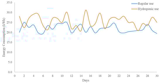 The power consumption of air conditioning unit was monitored using a commercial power meter which was digitized to store data for evaluation. The cooling capacity of 2 ton is equal to 7.034 kW of power and power consumption of AC is cooling capacity/Energy Efficiency Ratio (EER). A two-ton air conditioner typically consumes 2.6 kW while EER = 2.7 for a typical 3-star AC. AC consists of two units, Indoor unit which is called the evaporator and the Outdoor unit which is called the Compressor. The power consumed by the evaporator is very less as compared to the compressor. Compressor unit starts only when the indoor temperature is more than desired temperature and stops once the desired temperature is achieved. Assuming 60% of the total on time compressor unit is on, energy consumption per hour of running is 1.56 kWh. However, overall monthly consumption depends on the daily usage. In Qatar, from March (18–27 °C) till May (26–39 °C) and September (28–39 °C) till November (20–30 °C) (please refer to [,] for more details of temperature profile), the air conditioner is typically remains ON for few hours in a day and it typically runs for longer duration during May to September []. Since the hydroponic system was placed in a room, where air conditioner is typically maintained by the room-users however, it was not known to us the difference between the regular usages in comparison to the usage due to hydroponic system. Therefore, a typical monthly usage of the air conditioner was logged, and the usage of the same air conditioner was logged when it was controlled by the hydroponic system to investigate the difference in monthly consumption. It is important to see whether there is a major difference in the power consumption due to hydroponic system or not.